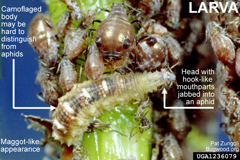 As with all flies these larvae are maggots. They may be camouflaged and blend in with their surroundings. The larvae have hooks for jaws that they use to consume aphids.